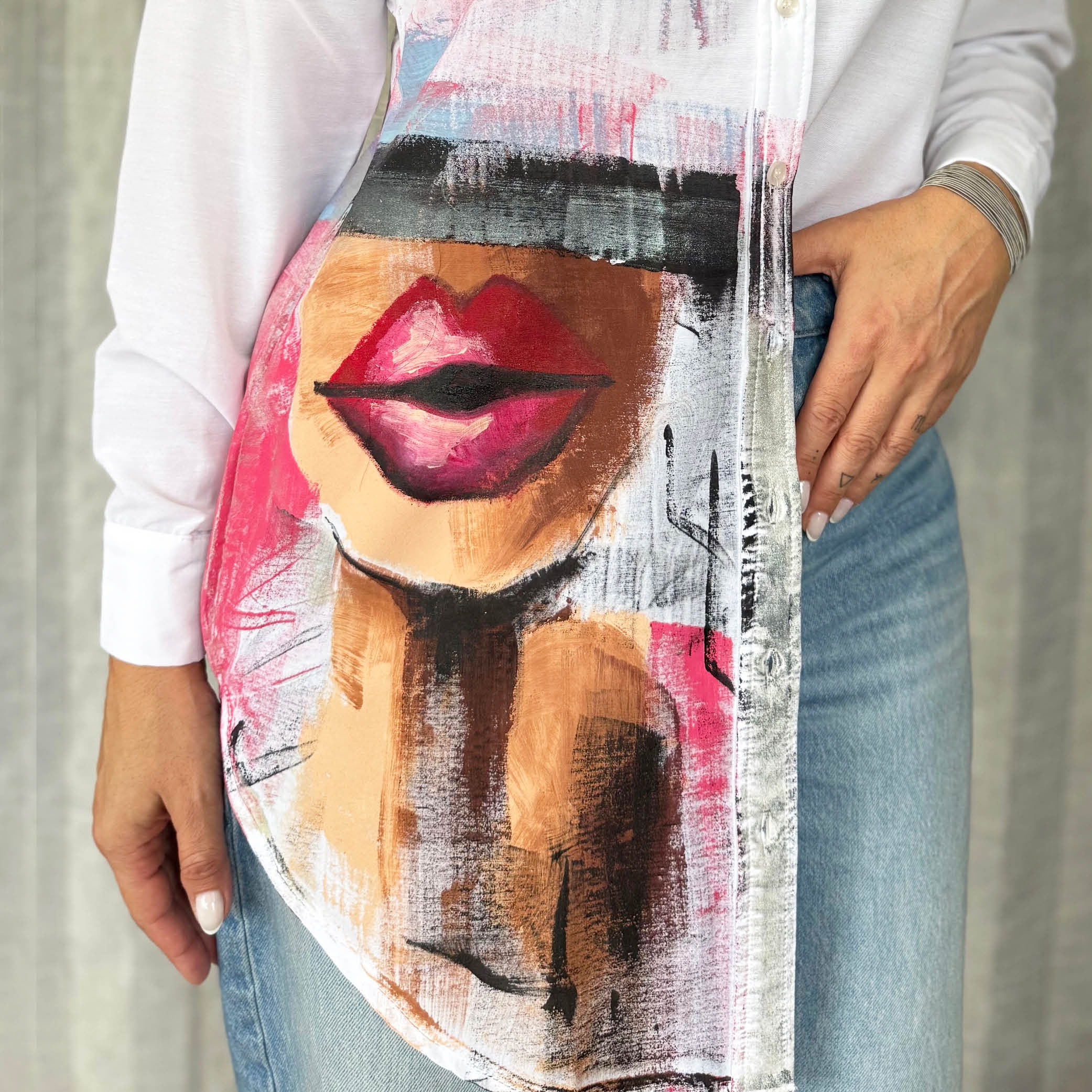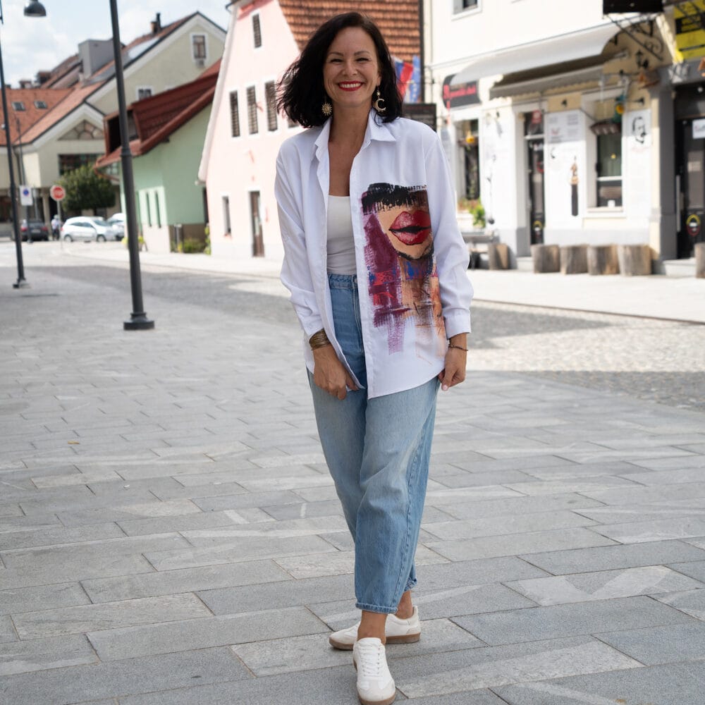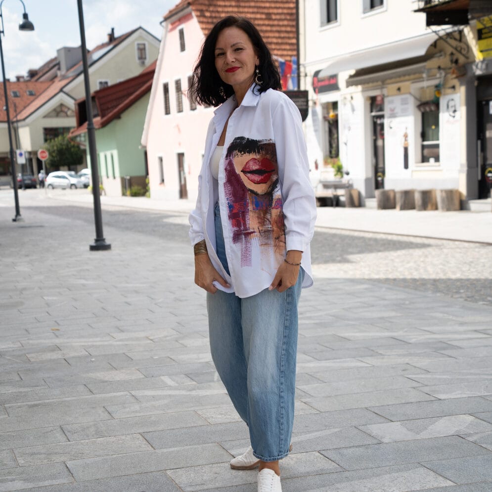 Njena posebnost je v tem, da vsaka srajca nastane kot nosljivo umetniško delo. Ročno poslikana z natančnimi potezami čopiča, nosi v sebi zgodbo trenutka, v katerem je bila ustvarjena. Noben kos ni enak drugemu, kar pomeni, da v svoji garderobi nosiš nekaj povsem svojega – unikaten izraz umetnosti, ki ga ni mogoče ponoviti.