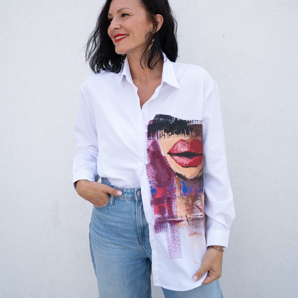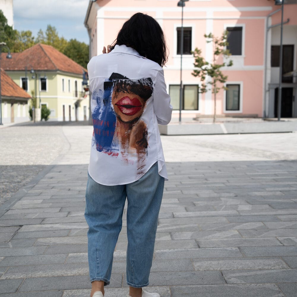 Unikatna bela bombažna srajca Redlips z ročno poslikavo. Kvaliteten bombaž, udobna eleganca in umetniški izraz, pralna na 30 °C.