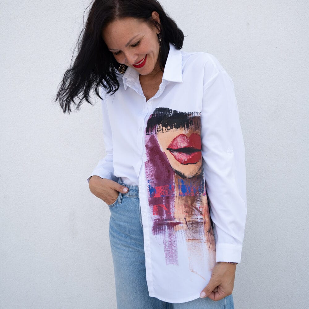 Bela osnova daje prostor, da barve poslikave zasijejo v polnem sijaju, motiv pa prinese drzen in hkrati eleganten poudarek tvojemu stilu. Srajca se lahko nosi na več načinov: kot samostojen statement kos, v kombinaciji z jeansom za sproščen videz ali pa pod suknjičem za sofisticirano eleganco.